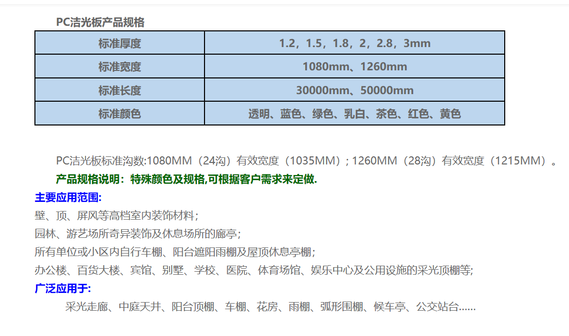 主營:PC耐力板、PC波浪瓦、PC陽光板、PC潔光板、PC雨陽蓬、PC壓條、PC配件,承接任何塑料工藝成型深加工,昊塑板材具有:抗紫外線、耐老化、抗沖擊、隔音、隔熱、難燃等優(yōu)異性能,成為樓頂采光、高速公路隔音、燈箱廣告、候車廳、家居陽臺等的不錯之選。