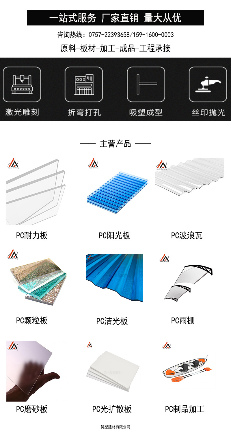 昊塑建材有限公司是一家專業(yè)從事聚碳酸酯(PC)高級(jí)工程板材研發(fā)、生產(chǎn)和銷售的公司。 主營(yíng):PC耐力板、PC波浪瓦、PC陽光板、雨陽蓬、PC壓條、PC配件,承接任何塑料工藝成型深加工,昊塑板材具有:抗紫外線、耐老化、抗沖擊、隔音、隔熱、難燃等優(yōu)異性能,成為樓頂采光、高速公路隔音、燈箱廣告、候車廳、家居陽臺(tái)等的不錯(cuò)之選。